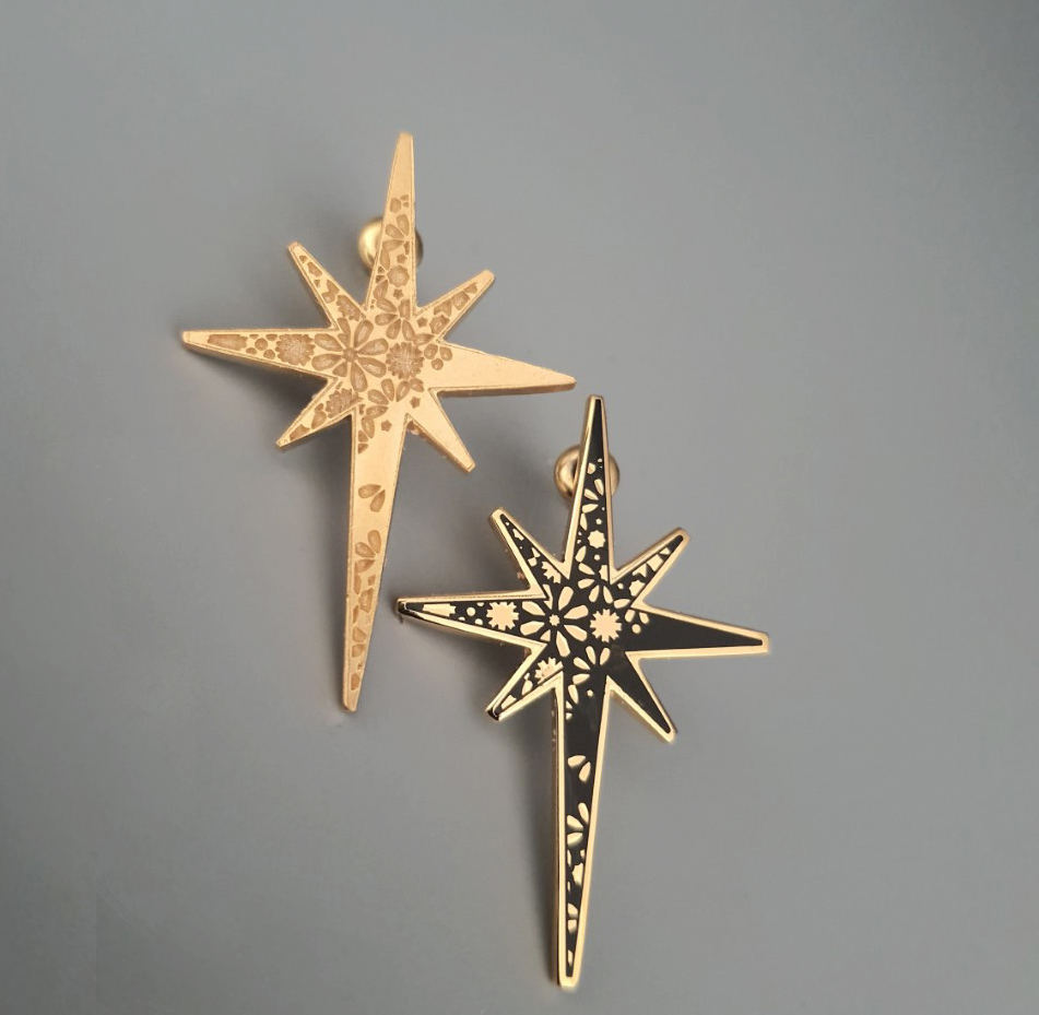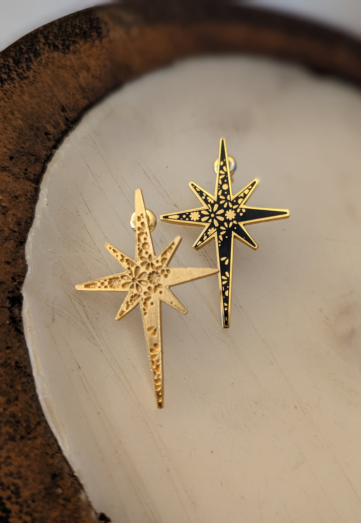 - Mismatched plated floral pattern north star earrings.